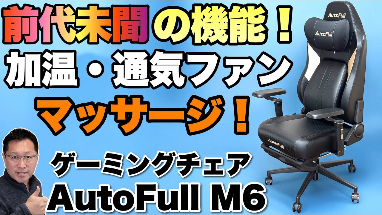 オフィスチェアが好きな戸田覚が感動したゲーミングチェアを紹介します。 AutoFull M6 ゲーミングチェアは、可動部が多く長時間座っても疲れにくいのがいいですね。さらに、通気ファン、ヒーター、マッサージ機能を搭載するという驚きの製品です! ※今回はメーカー様提供の動画です
